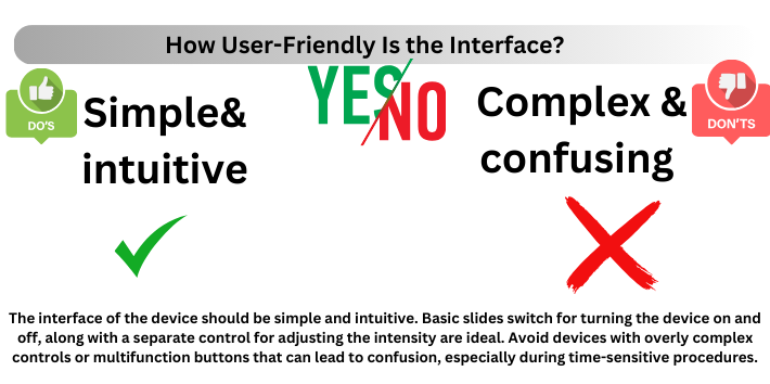 The interface of the device should be simple and intuitive. Basic slides switch for turning the device on and off, along with a separate control for adjusting the intensity are ideal. Avoid devices with overly complex controls or multifunction buttons that can lead to confusion, especially during time-sensitive procedures.