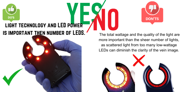 Instead of focusing solely on the number of LEDs, check the light technology and wattage per LED. A device with fewer, more powerful LEDs (e.g., 6 LEDs at 2-3 watts each) will typically provide better vein visualization than one with a higher number of less powerful LEDs (e.g., 30 LEDs at 0.5 watts each). The total wattage and the quality of the light are more important than the sheer number of lights, as scattered light from too many low-wattage LEDs can diminish the clarity of the vein image.
