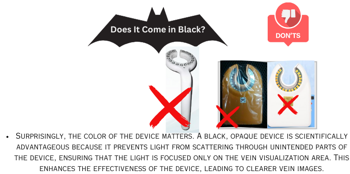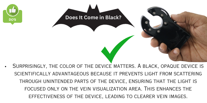 Surprisingly, the colour of the device matters. A black, opaque device is scientifically advantageous because it prevents light from scattering through unintended parts of the device, ensuring that the light is focused only on the vein visualization area. This enhances the effectiveness of the device, leading to clearer vein images.