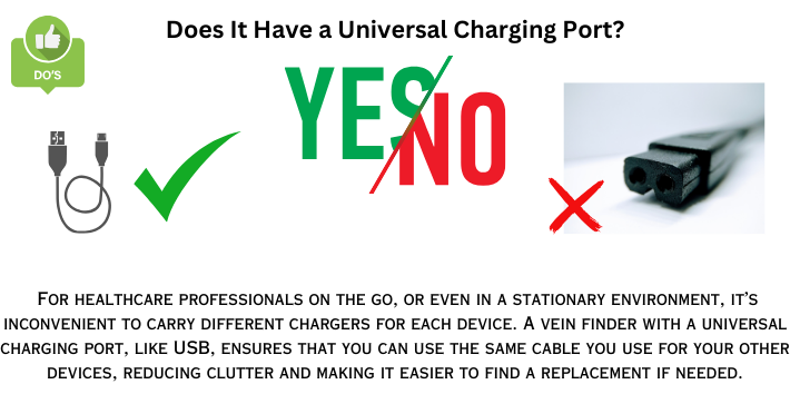 For healthcare professionals on the go, or even in a stationary environment, it’s inconvenient to carry different chargers for each device. A vein finder with a universal charging port, like USB, ensures that you can use the same cable you use for your other devices, reducing clutter and making it easier to find a replacement if needed.