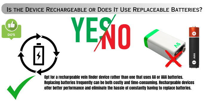 Opt for a rechargeable vein finder device rather than one that uses AA or AAA batteries. Replacing batteries frequently can be both costly and time-consuming. Rechargeable devices offer better performance and eliminate the hassle of constantly having to replace batteries.