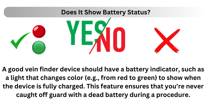 A good vein finder device should have a battery indicator, such as a light that changes color (e.g., from red to green) to show when the device is fully charged. This feature ensures that you’re never caught off guard with a dead battery during a procedure.